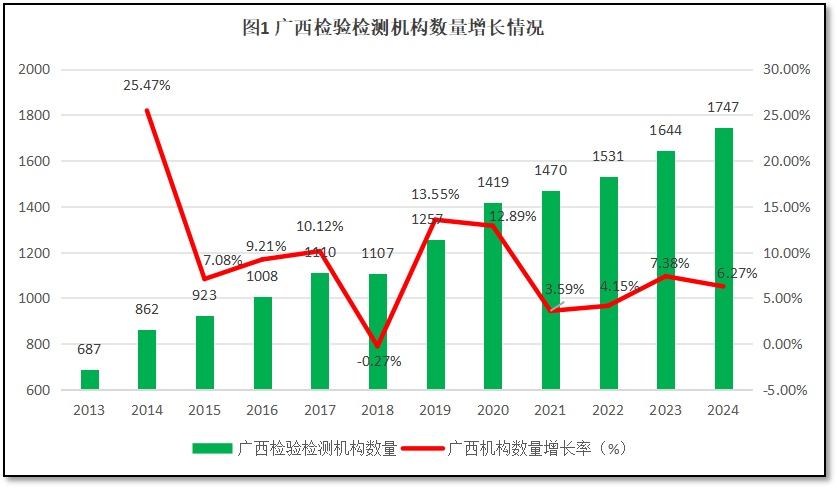 由图1可见,过去12年,四川省检验检测机构数量总体保持增长,但2021年之后增长趋缓,2024年甚至较2023年还出现了微弱的下降。2024年末,四川省的检验检测机构数是2562家,是2013年末的2.98倍,年均增速为10.85%。从年度增长率曲线来看,四川省检验检测机构数量除了在头两年统计数据质量不高的时候显得增速很大之外,从2015年起增幅相对平稳,逐步走低,2024年首次降到负值,为-0.35%。最近10年,四川省检验检测机构数量的年均增速为8.4%。