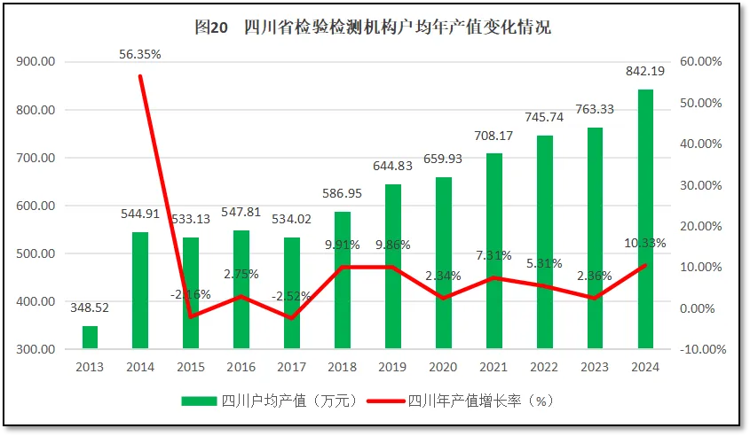 由图17可见,过去12年,四川省检验检测机构人均年产值持续保持增长,2024年达到28.58万元,是2013年的1.76倍。从增长率来看,在2018年出现一个增长峰值,年度同比增幅达到15.49%,其他年份在10%以内波动。不过,由于四川省检验检测机构人均年产值的起点低,尽管过去12年四川省检验检测机构人均年产值年均增幅达到5.41%,但至今仍未达到检验检测行业的“温饱线”。2024年,四川省检验检测机构人均年产值增幅较大,有望在未来两三年内突破温饱线,甚至超过全国平均数。