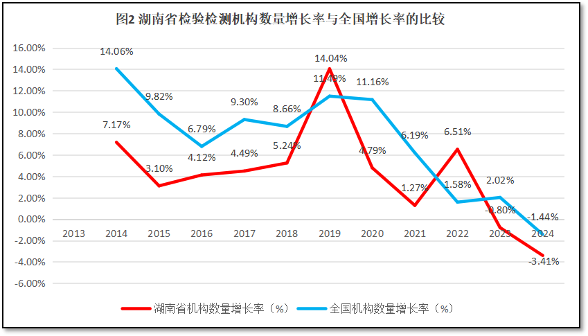 四川省检验检测机构数量增长率与全国检验检测机构数量的增长率进行比较,结果如图2所示。