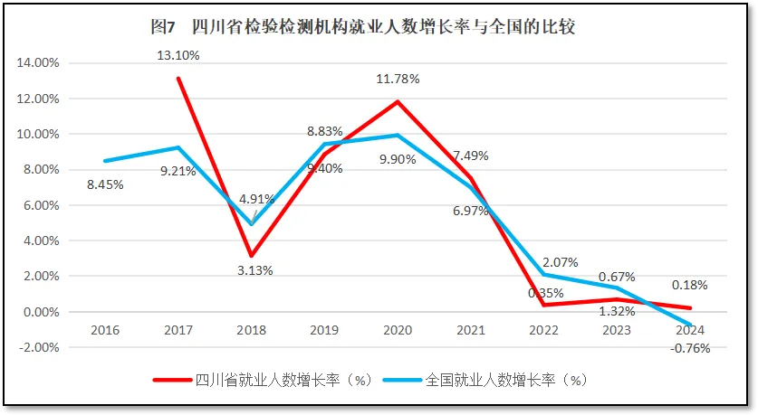 四川省检验检测机构就业人数增长率与全国检验检测机构就业人数增长率的比较,如图7所示。