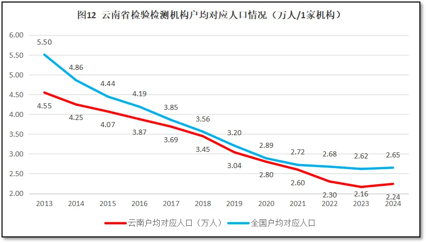 再来看云南地区检验检测机构户均对应服务的人口情况。2024年末,云南省常住人口4655万人,检验检测机构户均服务人口2.24万人,比全国平均数2.65万人低了4100人,排名全国第19位,较2023年度排名提升1位。云南省检验检测机构户均对应人口数量在全国的排名比较靠后,相对于云南省不大的人口数量来说,当地的检验检测机构数量显得过多。过去12年云南省检验检测机构户均对应的人口数量与全国的情况进行比较,如图12所示。