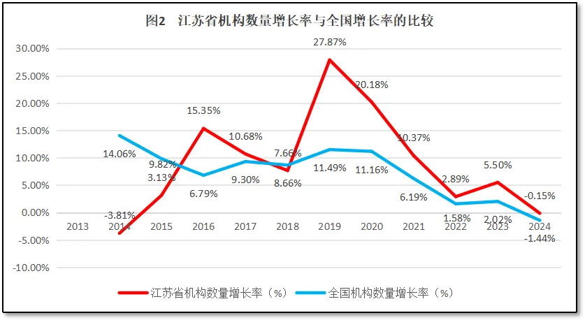 江苏省检验检测机构数量增长率与全国检验检测机构数量的增长率进行比较,如图2所示。