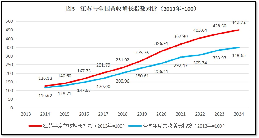 由上图可见,在2014-2015年江苏省检验检测机构营收总额增长指数略高于全国平均数,未显示出特别明显的差距,但随着时间的推移,江苏省的指数增长迅速,逐步拉开了与全国平均数的差距,到2024年增长指数相差超过了100。