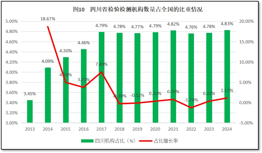 截至2024年末,四川省检验检测机构数量为2562家,约占全国检验检测机构数量的4.83%,排名全国第6。过去12年,四川省检验检测机构数量在全国检验检测行业中的占比以及占比的增长率,如图10所示。