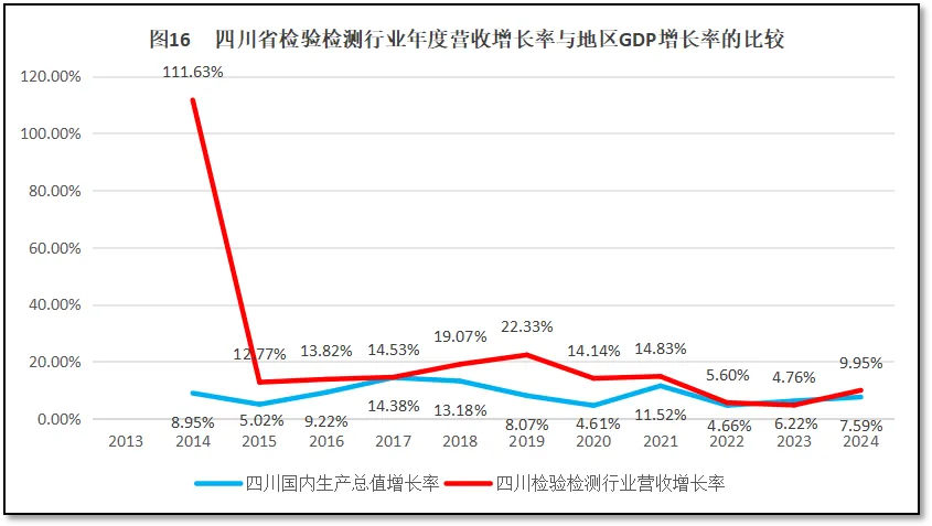 四川省GDP年度增长曲线与四川省检验检测机构年度营收总额增长曲线的比较,如图16所示。