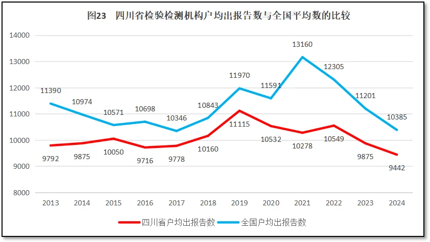 2024年度,四川省检验检测机构户均出具检验检测报告9442份,是全国平均水平10385份的90.9%,全国排名保持在第9位,处于中等偏上水平。从2013年以来,四川省检验检测机构户均出具检验检测报告数量与全国的比较,如图23所示。