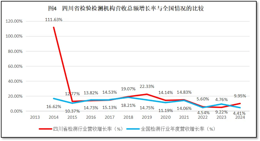 由图4可见,2015年以后,四川省检验检测行业年度营收总额的增长率曲线与全国检验检测机构年度营收增长率曲线非常相似,在很多年份数据几乎重合,个别年份四川省的年度增幅略微高于全国平均水平。2024年,四川省检验检测机构营收总额增长率高于全行业平均水平,且高出近1倍。综合四川省检验检测机构数量和营收总额的数据变化情况,可以认为四川省检验检测行业发展十分平稳,与全国总体走势十分一致,2024年保持了较高的增速,显示出更加强劲的发展势头。