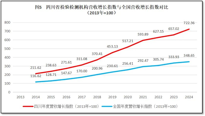 由上图可见,四川省检验检测机构营收总额增长指数一直保持着高于全国平均数的水平发展,曲线始终高于全国平均线,显示出较强的发展实力。且随着时间的推移,四川省检验检测机构营收增长指数还逐步拉大了与全国平均数的差距,到2024年增长指数相差接近374,说明四川省检验检测行业发展质量较高,在过去12年中检验检测机构营收状况总体良好。