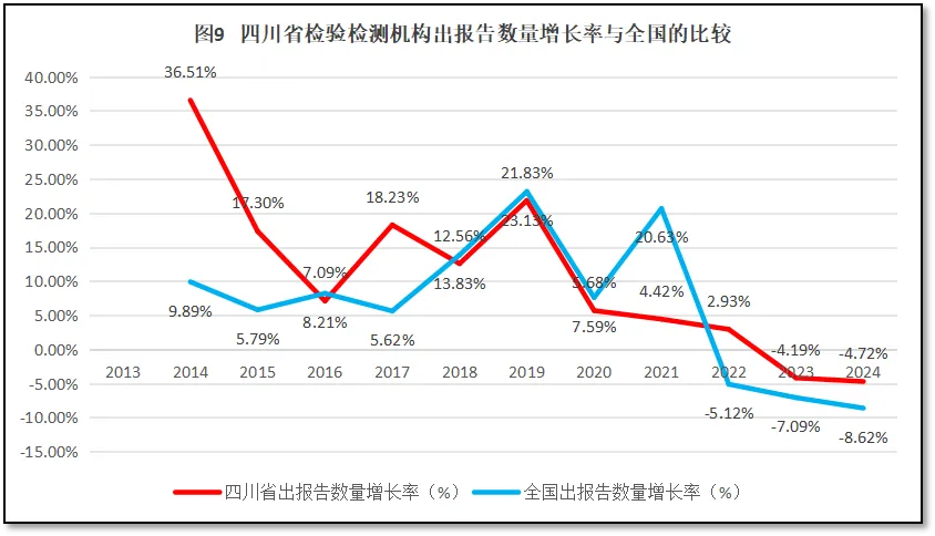四川省检验检测机构出具报告数量的增长率与全国检验检测机构出具报告增长率的比较,如图9所示。
